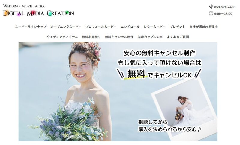 | ウェディングムービー制作 Digital Media Creation | 1,980円~/1本 | ・制作後 もし気に入らない場合は無料でキャンセル可能 ・ムービーを1本注文でもう1本ムービーをプレゼント |