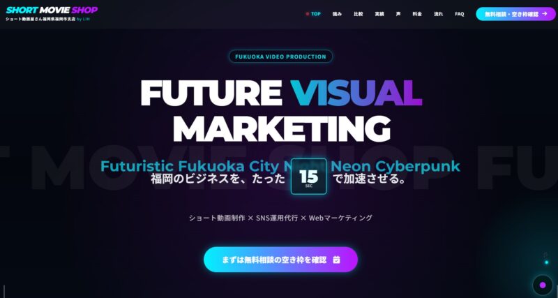 | ショート動画屋さん 福岡県福岡市支店 | ・ショート動画制作:1本 2万円台〜 ・月額運用プラン:要お見積もり ※ご予算や本数に応じて柔軟にプランニング可能です。 | ・圧倒的なコストパフォーマンス:徹底した業務効率化により、業界最安級の「1本2万円台〜」を実現。予算内で多くの動画を制作・検証できます。 ・丸投げOKのワンストップ支援:企画・構成からキャスティング、撮影、編集までを一貫して対応。お客様の手間を最小限に抑えます。 ・マーケティング視点の企画力:単なる動画制作だけでなく、運営元であるLIHのデジタルマーケティング知見を活かし、集客や採用などの「成果」につながる構成をご提案します。 |