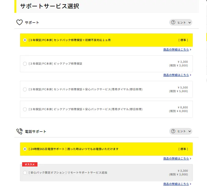 👇「マウスコンピューター」の場合、以下のようにサポートを充実させることができます。